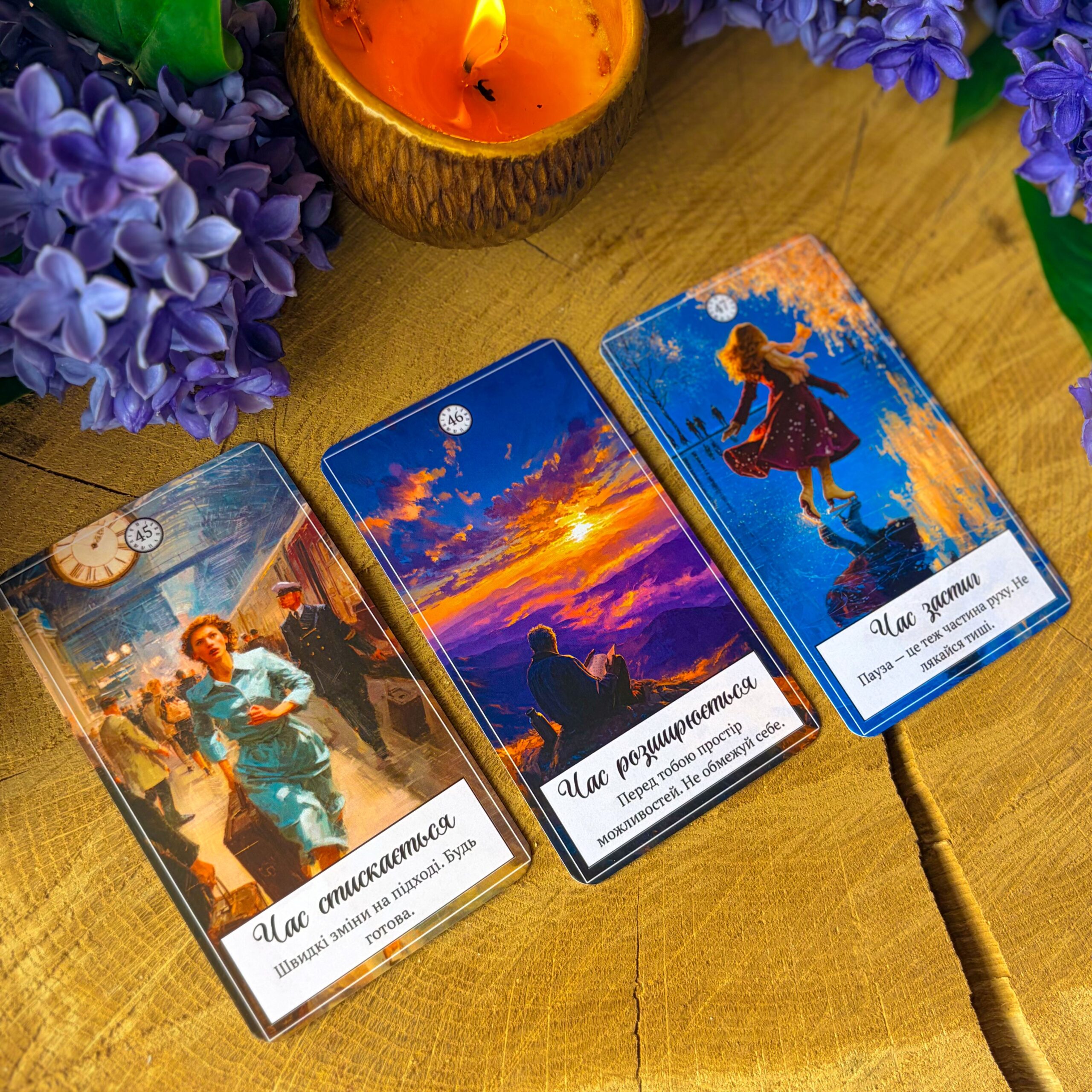 Карти розкривають тему часу не лише як хронології, а як внутрішнього процесу — дозрівання, очікування, змін і правильного моменту. Вона підходить для розкладів на майбутнє, визначення таймінгу, аналізу життєвих циклів і прийняття рішень.