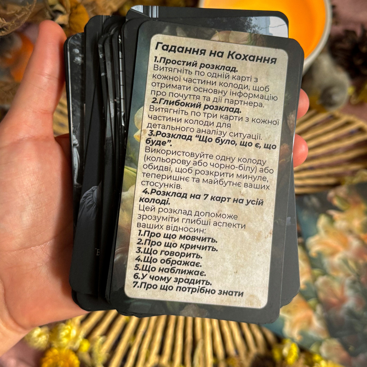 Ця колода — справжній провідник у світ почуттів і намірів. Вона складається зі 123 карт із преміум якістю: матова ламінація та щільний картон 400 г/м², що дарує приємні тактильні відчуття та довговічність.
