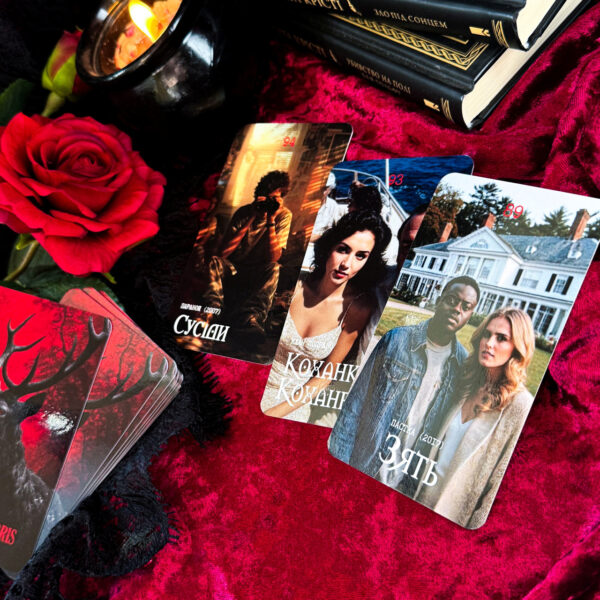 На звороті кожної карти зображено кривавого оленя на бордовому тлі — провідника між світами, мисливця і жертву водночас. Він нагадує, що у темряві немає правил — є лише страх і кров.